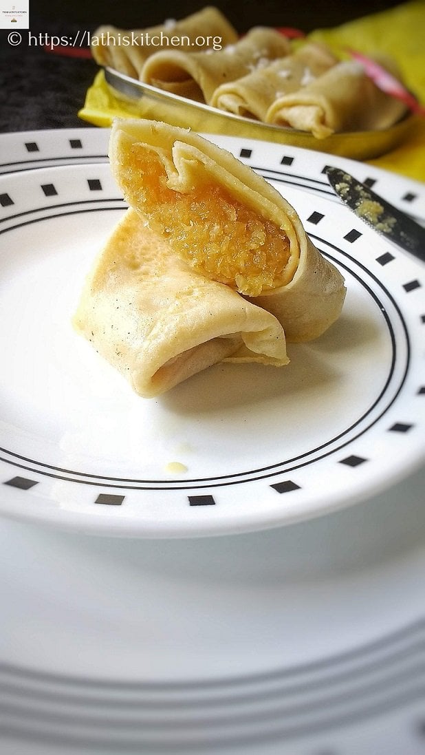 These mildly sweet coconut stuffed pancakes are surely a treat.