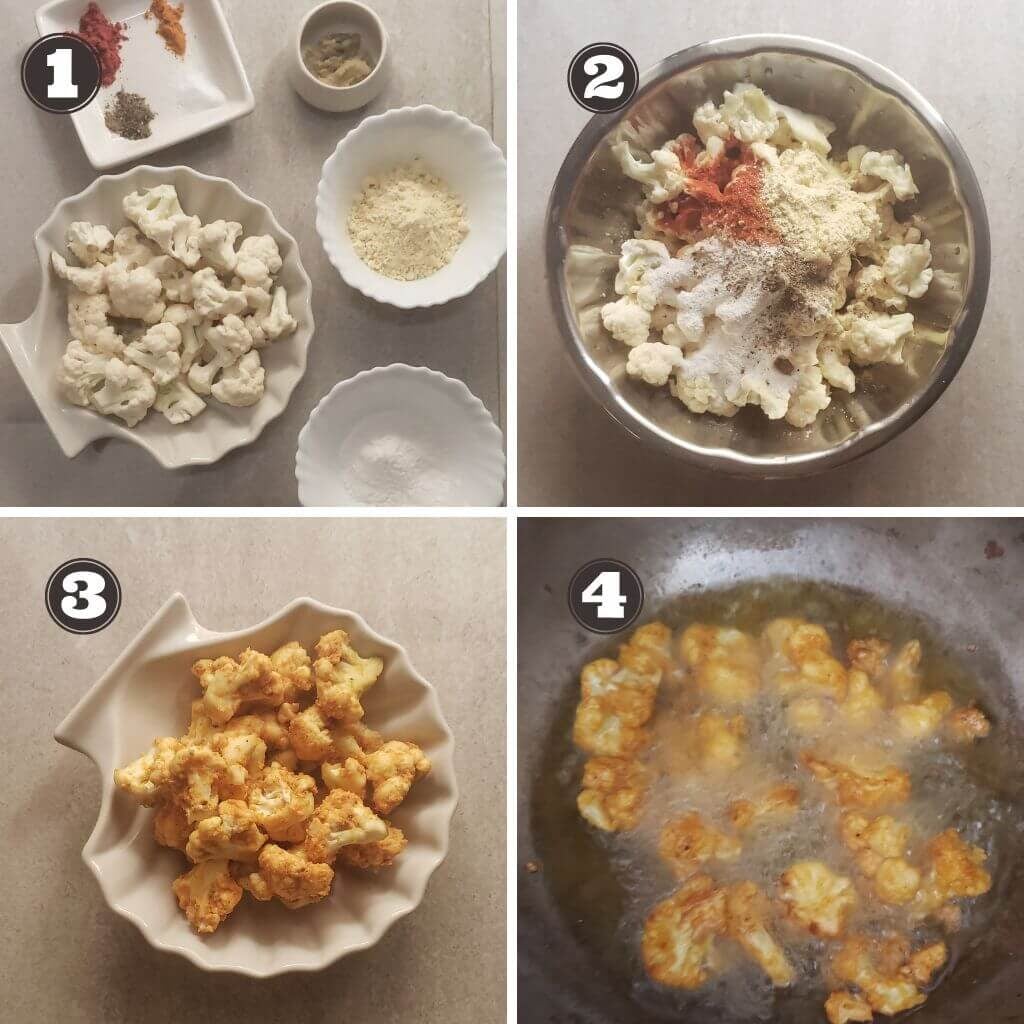 Cut a medium cauliflower into small florets. It gives you approximately 2 cups of florets. Add all ingredients except oil to florets and mix well. Sprinkle little water just to bind the flour to the florets. Keep aside for 30 mins to 1 hour. Heat oil in a pan. Fry the florets in medium flame till it turns golden brown.