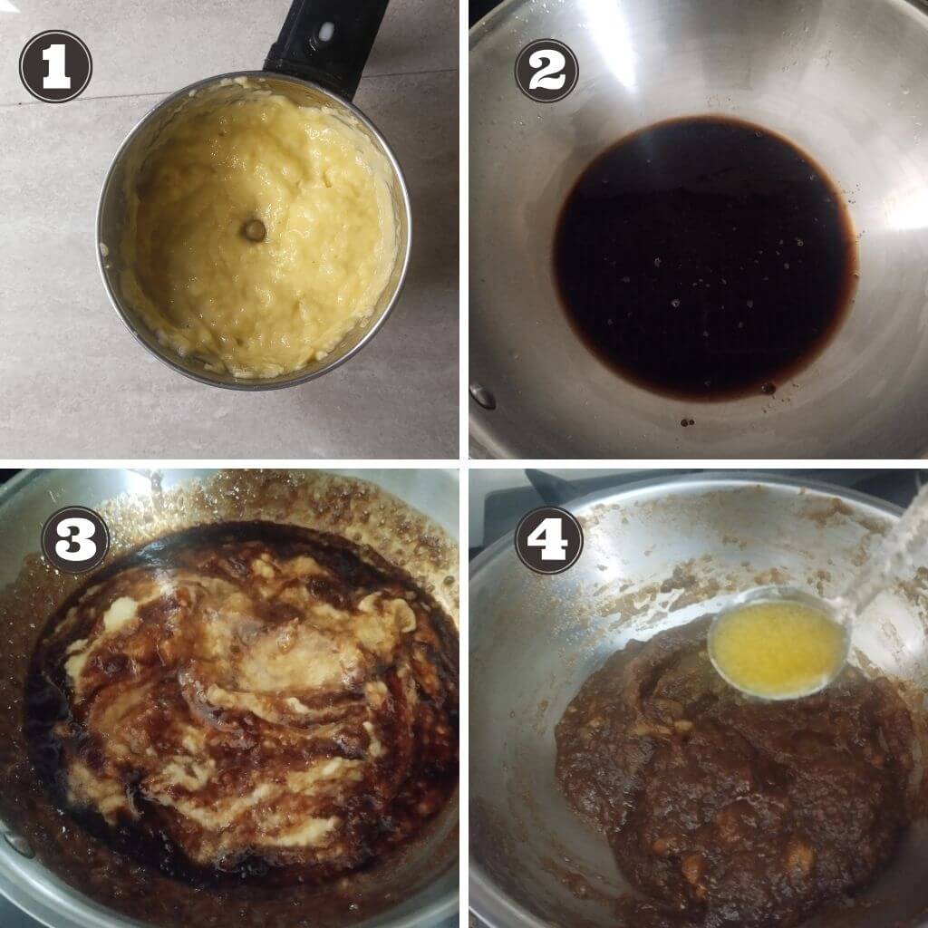 Cut the jackfruit roughly and puree it in a blender. Make a jaggery or brown sugar syrup and strain to remove any impurities. Check out sweet aval on how to make jaggery syrup. In a heavy-bottomed pan, heat the jaggery syrup. When it starts bubbling, add the jackfruit puree. Whisk it thoroughly so the puree mixes with the syrup. Let it cook in a slow flame. You need to stir it frequently so it doesn’t stick to the bottom of the pan.