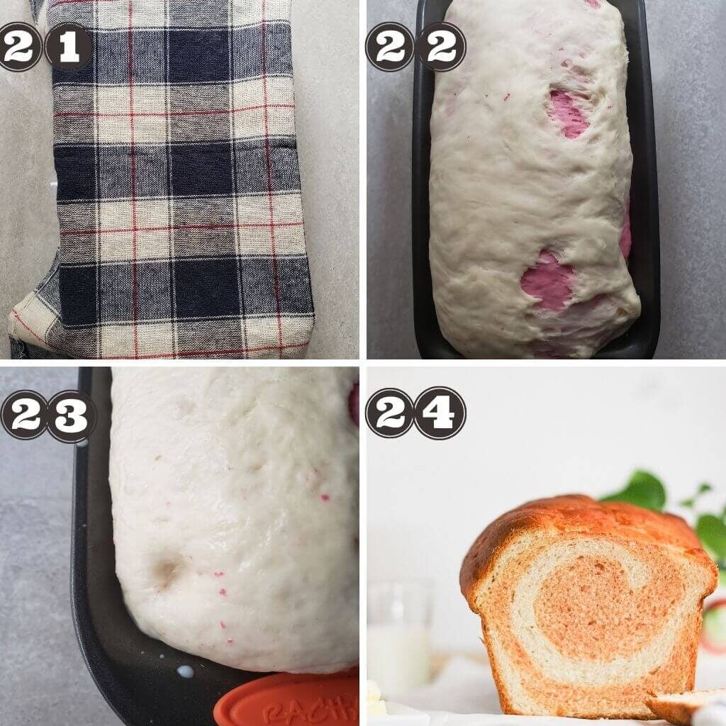 Once the dough is rolled, pinch the ends so it doesn’t open up while baking. Place the rolled bread dough in the greased baking bread pan. Cover it and let it proof for 30 minutes or until doubled the size. You know, it’s proofed when you make a dent in the corner and the dent stays.