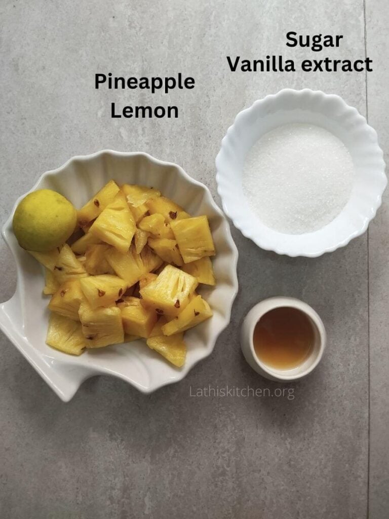 To make this pineapple jam, you need just a handful of ingredients. Pineapple, sugar, lemon juice, vanilla essence, and a pinch of salt. Just cook all the ingredients together till the jam consistency. The addition of vanilla essence enhances the flavor of the jam.