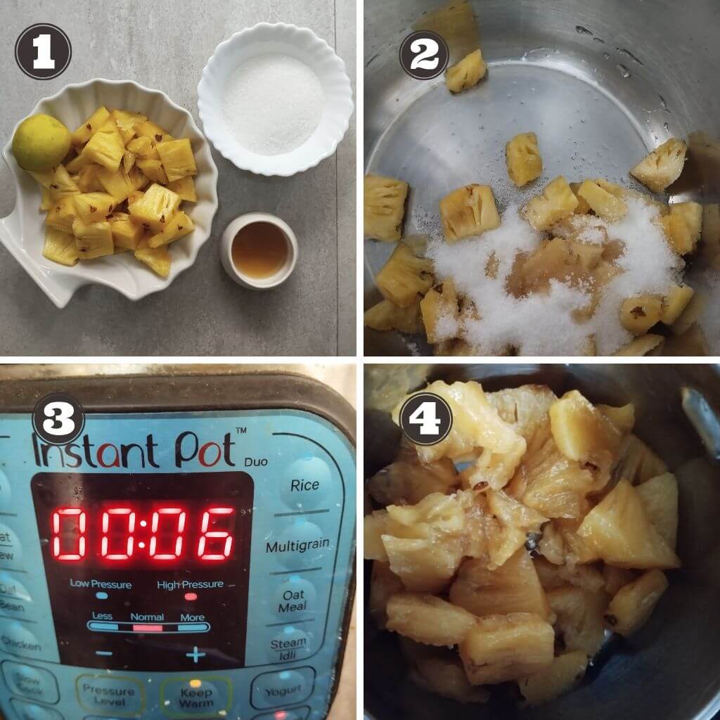 - Add pineapple chunks and sugar to an Instant Pot. Give a nice stir and set the timer to 6 minutes of high pressure.