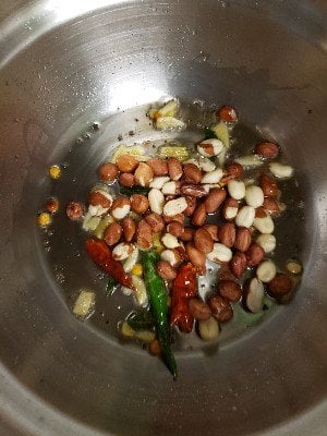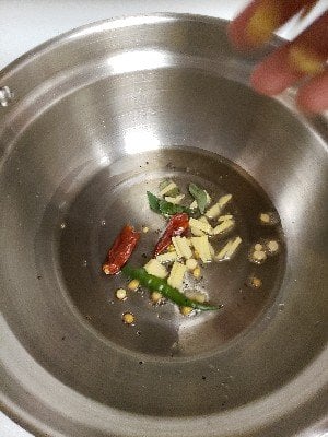 - When mustard seeds crackle, add chana dal, curry leaves, green chili and dry red chili.