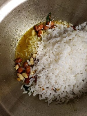 - Add cooked rice and give a gentle mix till all the rice is covered.