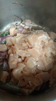 - Add cubed chicken and stir for 5 minutes.Add turmeric powder,coriander powder, cumin powder and tomatoes.