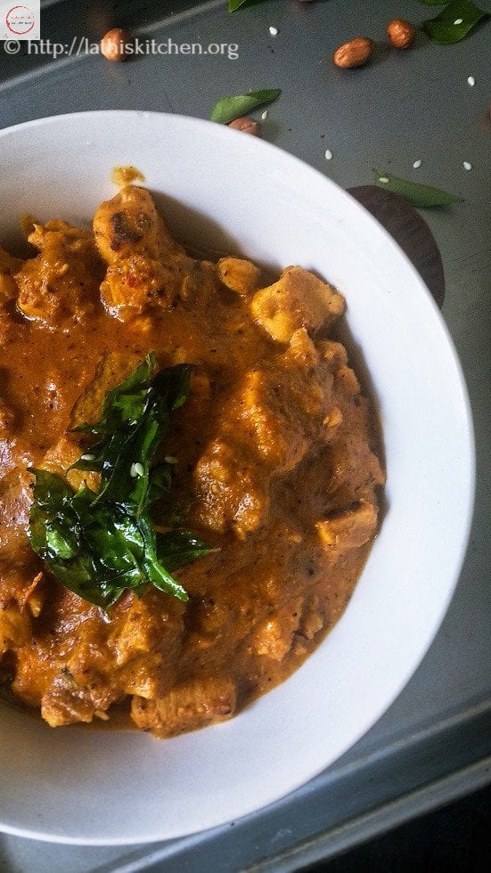 Andhra Chicken Curry, as the name suggests is from Andhra Pradesh. It is a South Indian state famous for its spicy food. They include peanuts in most of their dishes. This curry too has peanuts. The awesome taste comes from the freshly ground peanuts and chili masala along with sesame seeds and poppy seeds. I was doubtful if my husband would like this curry as he doesn’t like peanuts in a curry. But to my surprise he loved it and even my daughter licked the bowl off.