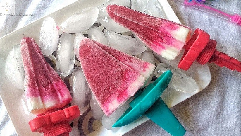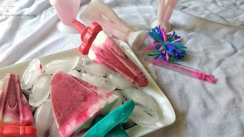 We enrolled them in the swimming class. It’s twice a week. But what about other days? Hmmm, finally I came up with yarn crafts and bubbles came to my rescue. We were making bracelets, pom poms with yarn, and having fun blowing bubbles on our patio. Being so hot, the kids asked me to make some popsicle. Having watermelon in hand, I was thinking of making something interesting. That’s when I saw a half-cut beetroot in the fridge. And Watermelon Beetroot Yogurt Popsicle was born.