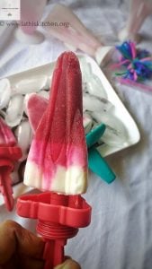 I decided to make it a layer. So I blended yogurt in the same mixer I used to blend beetroot and watermelon which gave a beautiful pink color. The last layer was just yogurt. I used honey as sweetening. You can use either honey or sugar. Then layer it in your popsicle mold. Make sure that the first layer is set before you pour the second layer. I didn’t have that patience, so you can’t see my second layer prominently. But who cares about the layers when one is interested in the taste of the popsicle?