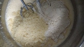 - Add sugar and beat till dissolved.Add milk,grounded almonds and whole wheat flour.