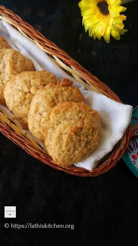 So as a Mom, my job is to give them healthy and same time, kid-approved lunches and snacks. For lunch, I usually give them Carrot Chapathi, Palak Chapathi, Cilantro Chapathi, Aloo Paratha, and Sooji Upma. For snacks, I give them some crackers, Whole Wheat Butter Cookies. I already made a big batch of Cake Rusk for my son to have along with morning milk. To add to that list, I made these Whole Wheat Coconut Cookies. This became an instant hit with my kids. They were asking for more. It has a perfect coconut flavor and crunch. It’s crispy outside and soft chewy inside. The best part is no rolling, no cooling time. Just drop it and bake it.